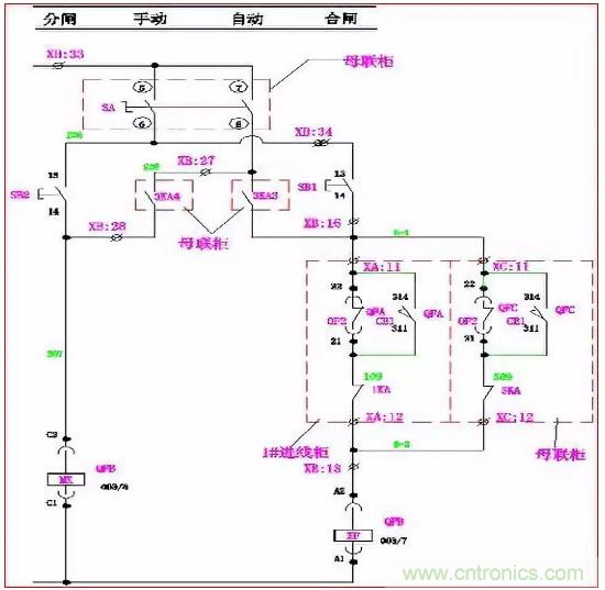 手動時(shí):當(dāng)QFA、QFB合閘,QFC合閘回路C-1、C-2斷開,其合閘線圈XF無法得電, QFC不能滿足合閘條件;同理,當(dāng)QFA、QFC或QFB、QFC同時(shí)合閘時(shí),QFB或QFA也同樣不能滿足合閘條件。使進(jìn)線柜與母聯(lián)滿足“三合二”邏輯。