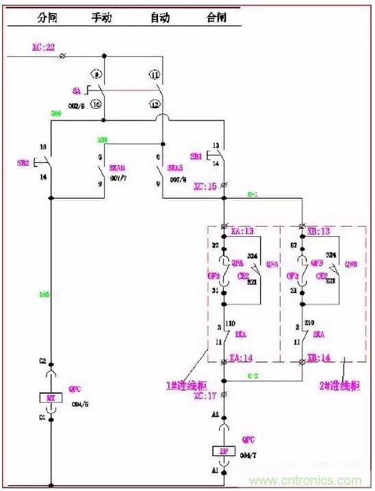 手動時(shí):萬轉(zhuǎn)SA的1、2腳連通。當(dāng)Q2、Q3合閘,Q1合閘回路A-2、A-3斷開,其合閘線圈XF無法得電, Q1不能滿足合閘條件;同理,當(dāng)Q1、Q2或Q1、Q3同時(shí)合閘時(shí),Q2或Q3也同樣不能滿足合閘條件。使進(jìn)線柜與母聯(lián)滿足“三合二”邏輯。