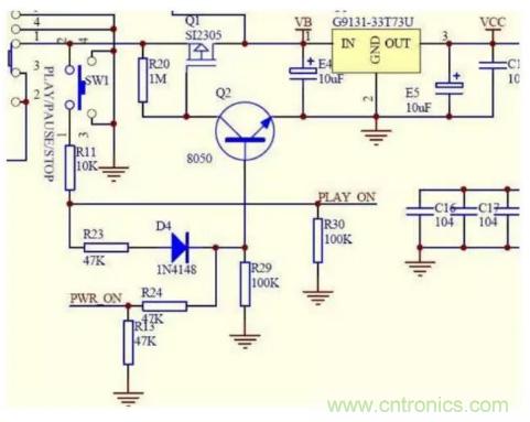 圖中電池的正電通過開關(guān)S1接到場效應(yīng)管Q1的2腳源極,由于Q1是一個(gè)P溝道管,它的1腳柵極通過R20電阻提供一個(gè)正電位電壓,所以不能通電,電壓不能繼續(xù)通過,3v穩(wěn)壓IC輸入腳得不到電壓所以就不能工作不開機(jī)!這時(shí),如果我們按下SW1開機(jī)按鍵時(shí),正電通過按鍵、R11、R23、D4加到三極管Q2的基極,三極管Q2的基極得到一個(gè)正電位,三極管導(dǎo)通(前面講到三極管的時(shí)候已經(jīng)講過),由于三極管的發(fā)射極直接接地,三極管Q2導(dǎo)通就相當(dāng)于Q1的柵極直接接地,加在它上面的通過R20電阻的電壓就直接入了地,Q1的柵極就從高電位變?yōu)榈碗娢?,Q1導(dǎo)通電就從Q1同過加到3v穩(wěn)壓IC的輸入腳,3v穩(wěn)壓IC就是那個(gè)U1輸出3v的工作電壓vcc供給主控,主控通過復(fù)位清0,讀取固件程序檢測等一系列動(dòng)作,輸處一個(gè)控制電壓到PWR_ON再通過R24、R13分壓送到Q2的基極,保持Q2一直處于導(dǎo)通狀態(tài),即使你松開開機(jī)鍵斷開Q1的基極電壓,這時(shí)候有主控送來的控制電壓保持著,Q2也就一直能夠處于導(dǎo)通狀態(tài),Q1就能源源不斷的給3v穩(wěn)壓IC提供工作電壓!SW1還同時(shí)通過R11、R30兩個(gè)電阻的分壓,給主控PLAY ON腳送去時(shí)間長短、次數(shù)不同的控制信號(hào),主控通過固件鑒別是播放、暫停、開機(jī)、關(guān)機(jī)而輸出不同的結(jié)果給相應(yīng)的控制點(diǎn),以達(dá)到不同的工作狀態(tài)!