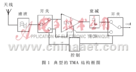 很多情況下,因?yàn)榛九c移動(dòng)設(shè)備不平衡連接的緣故,從基站到移動(dòng)設(shè)備的信號(hào)強(qiáng)度和傳輸距離都要超過(guò)移動(dòng)設(shè)備向基站的反向傳輸,并且由于天線與基站間的反饋損耗,使得這種不平衡性變得更大。為了改善這種不平衡性,擴(kuò)大基站接收的覆蓋面,最直接的解決方案是加裝塔裝放大器TMA或Masthead放大器。而TMA中最重要的模塊LNA(如圖1所示)對(duì)接收的信號(hào)具有選頻功能,并把選頻后的信號(hào)進(jìn)行低噪聲放大,使系統(tǒng)靈敏度增強(qiáng),覆蓋半徑增大。