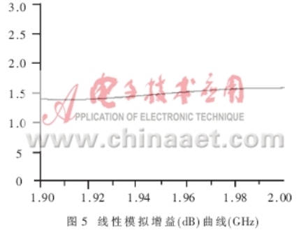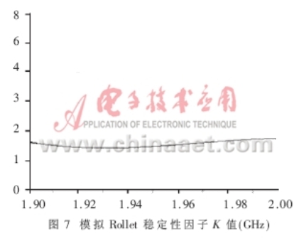 除了能夠得出增益、NF、P1dB和輸入輸出回波等重要參數(shù)外,軟件模擬還能夠得出關(guān)于電路設(shè)計(jì)穩(wěn)定性的信息。它是電路能否正常工作的重要前提。模擬軟件計(jì)算Rollet穩(wěn)定性因子K和作穩(wěn)定性圓是兩種很容易做到的方法,它們可以明確地表示出穩(wěn)定性的數(shù)據(jù)。圖7示出的Rollett穩(wěn)定因子K的模擬值(K>1)表明:在1.9~2.0GHz工作帶寬范圍,電路能夠?qū)崿F(xiàn)無(wú)條件穩(wěn)定。