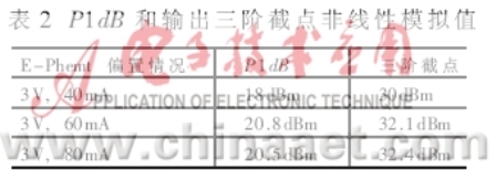 對(duì)于非線性模擬,常以諧波平衡模擬(HB)來(lái)實(shí)現(xiàn)。非線性模擬方法HB計(jì)算速度快,能夠處理分布元件和分立元件的電路,并很容易與更高階諧波及互調(diào)元件相容。ATF-54143管的P1dB和OIP3模擬非線性模型是基于W.R.Curtice模型,這個(gè)模型可以非常近似地模擬直流和小信號(hào)工作狀態(tài)(包括噪聲),對(duì)于截點(diǎn)的模擬則做出模擬預(yù)測(cè)結(jié)果比實(shí)際值要偏低。P1dB和OIP3的值如表2 所示:當(dāng)平衡LNA放大器的OIP3模擬結(jié)果為32.1dBm時(shí),P1dB則為20.8dBm,P1dB的模擬結(jié)果與實(shí)際的測(cè)量結(jié)果很接近,而OIP3的模擬結(jié)果則偏低,實(shí)際的測(cè)量結(jié)果達(dá)到37dBm。
