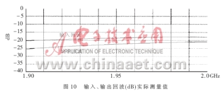 得到了完整的電路PCB板后,就要實(shí)際測(cè)量電路的各個(gè)參數(shù),驗(yàn)證設(shè)計(jì)的仿真結(jié)果是否與之相符,是否最終符合表1的設(shè)計(jì)技術(shù)規(guī)范。本文所采用的測(cè)試儀器是HP8753ES網(wǎng)絡(luò)分析儀和HP8970B噪聲儀。圖8、圖9表達(dá)出放大器實(shí)測(cè)的NF和增益曲線,在帶寬為0.1GHz的頻率范圍內(nèi)NF的值在0.8dB和1.0dB之間,增益在1.97GHz達(dá)到最大值15.5dB,在1.99GHz達(dá)到了15.3dB。由于NF是在實(shí)際PCB板外腔體內(nèi)測(cè)得的,包含了同軸連接器的損耗和二級(jí)噪聲損耗,其測(cè)量指標(biāo)表明實(shí)際的電路NF特性要稍差于模擬特性。圖10是輸入、輸出的回波曲線。當(dāng)頻點(diǎn)在1.96GHz時(shí),輸入回波為18dB,輸出回波達(dá)到22.5dB,放大器的OIP3在直流偏置Vds=3V,Id=60mA時(shí)測(cè)得值為37dBm,P1dB為21.4dBm。電路在較低的偏置狀態(tài)下Vds=3V,Id=40mA放大器的NF和增益都沒(méi)有降低,只有OIP3測(cè)出下降為36.5dBm。