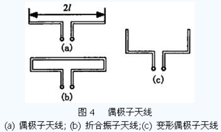 在遠(yuǎn)距離耦合的RFID 應(yīng)用系統(tǒng)中,最常用的是偶極子天線(又稱對稱振子天線) . 偶極子天線及其演化形式如圖4 所示,其中偶極子天線由兩段同樣粗細(xì)和等長的直導(dǎo)線排成一條直線構(gòu)成,信號從中間的兩個(gè)端點(diǎn)饋入,在偶極子的兩臂上將產(chǎn)生一定的電流分布,這種電流分布就在天線周圍空間激發(fā)起電磁場.利用麥克斯韋方程就可以求出其輻射場方程: