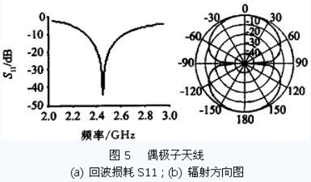 半波偶極子天線模型如圖4a 所示. 天線采用銅材料(電導(dǎo)率:5.8e7 s/ m ,磁導(dǎo)率:1) ,位于充滿空氣的立方體中心. 在立方體外表面設(shè)定輻射吸收邊界. 輸入信號由天線中心處饋入,也就是RFID 芯片的所在位置. 對于2. 45 GHz 的工作頻率其半波長度約為61mm ,設(shè)偶極子天線臂寬w 為1 mm ,且無限薄,由于天線臂寬的影響,要求實(shí)際的半波偶極子天線長度為57mm. 在Ansoft HFSS 工具平臺上, 采用有限元算法對該天線進(jìn)行仿真,獲得的輸入回波損耗S11 分布圖如圖5a 所示,輻射場E 面(即最大輻射方向和電場矢量所在的平面) 方向圖如圖5b 所示. 天線輸入阻抗約為72 Ω ,電壓駐波比(VSWR) 小于2.0 時(shí)的阻抗帶寬為14. 3 % ,天線增益為1.8.
