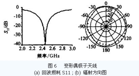 從圖5b 可以看到在天線軸方向上,天線幾乎無輻射. 如果此時(shí)讀寫器處于該方向上,應(yīng)答器將不會(huì)做出任何反應(yīng). 為了獲得全方位輻射的天線以克服該缺點(diǎn),可以對天線做適當(dāng)?shù)淖冃?如在將偶極子天線臂末端垂直方向上延長λ/ 4 成圖4c 所示. 這樣天線總長度修改為(57. 0 mm + 2 ×28. 5 mm) ,天線臂寬仍然為1 mm. 天線臂延長λ/ 4 后,整個(gè)天線諧振于1 個(gè)波長,而非原來的半個(gè)波長. 這就使得天線的輸入阻抗大大地增加,仿真計(jì)算結(jié)果約為2 kΩ. 其輸入回波損耗S11如圖6a 所示. 圖6b 為E 面(天線平面) 上的輻射場方向圖,其中實(shí)線為仿真結(jié)果,黑點(diǎn)為實(shí)際樣品測量數(shù)據(jù),兩者結(jié)果較為吻合說明了該設(shè)計(jì)是正確的. 從圖6b 可以看到在原來弱輻射的方向上得到了很大的改善,其輻射已經(jīng)近似為全方向的了. 電壓駐波比(VSWR) 小于2. 0 時(shí)的阻抗帶寬為12.2 % ,增益為1.4 ,對于大部分RFID 應(yīng)用系統(tǒng),該偶極子天線可以滿足要求.
