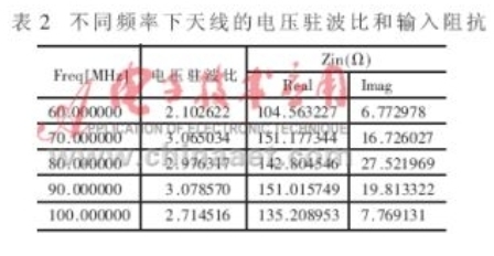 從文獻(xiàn)中可以查到本文所仿真的天線輸入電阻值約為150Ω,從文獻(xiàn)可以查到輸入電抗約為20Ω左右。實(shí)際上,不僅天線的輸入電抗與頻率有關(guān),而且不同頻率下輸入電阻也不同,利用仿真軟件可以比較準(zhǔn)確地得到這些參數(shù)。表2給出了幾種頻率下天線的輸入電阻與電抗值。從表2可以看出,仿真結(jié)果的輸入阻抗在工作頻帶內(nèi)與理論值有一定差別,隨著頻率接近天線頻率范圍的上下限,仿真結(jié)果與理論值相差越大。通過仿真計(jì)算所得到比較準(zhǔn)確的天線輸入阻抗,對(duì)于研究調(diào)制電路與天線的匹配問題有著非常重要的作用。