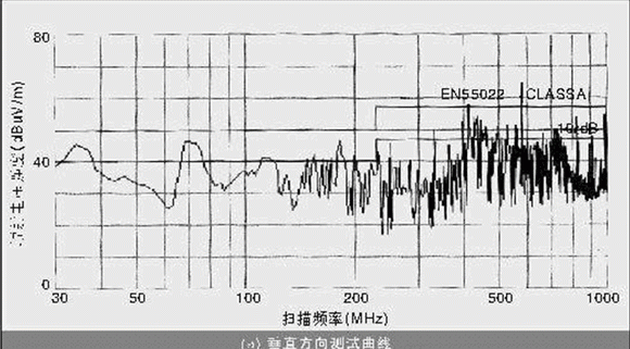 按照接入設(shè)備的電磁兼容(EMC)測試要求,設(shè)備上電正常運(yùn)行,測試儀器在30~1 000 MHz的頻率范圍內(nèi)進(jìn)行掃描,其中在30~230 MHz頻率范圍內(nèi)要求電磁干擾(EMI)的準(zhǔn)峰值低于40 dBuV/m,在230~1000 MHz頻率范圍內(nèi),EMI的準(zhǔn)峰值低于47 dBuV/m。測試的結(jié)果是:在垂直方向上,412.5 MHz處超標(biāo)4.08 dB,577.5 MHz處超標(biāo)3.5 dB;在水平方向上,577.5 MHz處超標(biāo)7.9 dB,參見圖1。