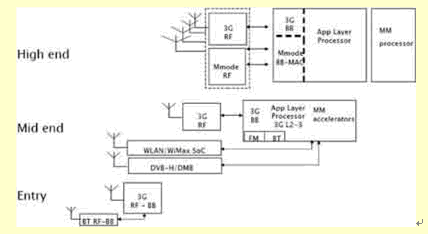 隨著多種無線技術(shù)標(biāo)準(zhǔn)在便攜無線設(shè)備中獲得應(yīng)用,客觀上要求便攜式無線設(shè)備以有成本效益的方式支持多個頻段以及多種不同的調(diào)制方式。業(yè)內(nèi)專家認為[1],目前多種無線標(biāo)準(zhǔn)在便攜式無線設(shè)備中的聚合將遵循入門級、中檔和高檔三種技術(shù)方案(圖1),采用CMOS數(shù)字無線電技術(shù)和可配置無線電技術(shù)是將來最終的解決方案。