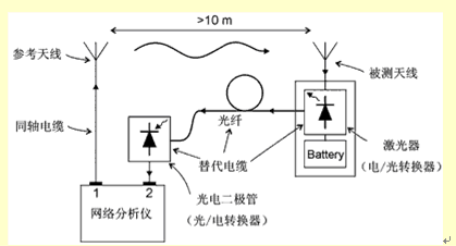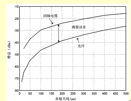 一般地講,我們不知道發(fā)射元件的效率和放大器的增益分別是多大(至少不能通過測量得到,但可以通過模擬或者模型分析得到這些數(shù)據(jù))。相反,G/T損失是直接通過測量天線的輸出噪聲總功率得到的,這時(shí)天線是放在一個(gè)特殊的環(huán)境中(例如在消聲室中,Ta=T0),增益是用增益置換法借助一個(gè)增益已知的參照天線通過測量得到的。但是要小心。要通過標(biāo)定把測量設(shè)備產(chǎn)生的噪聲去掉,在測量時(shí)沒有金屬物體(同軸電纜線或者電源線)和它相連。由于這個(gè)原因,萊爾德科技公司研制了一種代替電纜線的系統(tǒng),它利用了光纖的原理,連同一個(gè)用電池供電的前置放大器,這些在一起可以妥善地測定小天線的電氣特性(見圖1)。估計(jì)同軸電纜線引入的測量誤差的設(shè)置如圖2所示。圖2中,在單極天線從基板上伸出來的長度不同的情況下,用同軸電纜線和光纖系統(tǒng)測量了它們的增益??梢钥吹剑陂L度為10mm左右(這是內(nèi)置天線的實(shí)際長度)時(shí),測量誤差超過20dB。