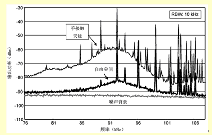 最后,要注意人體對(duì)小天線在FM調(diào)頻頻帶的增益的影響是正面的,尤其是使用者的身體與天線或者底板接觸的情況下。這是因?yàn)椋?00MHz左右,人體是效率相當(dāng)好的天線,半波長是1.5m左右。圖3給出了人體接觸天線和沒有接觸天線時(shí),接收天線的輸出頻譜。很明顯,用手接觸天線時(shí),G/T提高了10~15dB。由于大多數(shù)使用者在聽電話時(shí)和移動(dòng)電話是靠得很近的,所以可以合理地假定,F(xiàn)M調(diào)頻天線的實(shí)際性能優(yōu)于它處在自由空間時(shí)的性能。