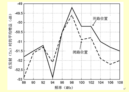 在發(fā)射時(shí),發(fā)射元件起標(biāo)準(zhǔn)的無源天線作用,它用一個(gè)單刀單擲(SPST)通斷控制進(jìn)行連接(見圖4)。前置放大器處在Rx狀態(tài),仍然與天線連接(但是切斷電源)。用一個(gè)內(nèi)阻為50Ω的信號(hào)源供給信號(hào)時(shí),失配的半圈天線的增益測定值如圖7所示。寬帶范圍的平均增益(或者效率)達(dá)到-53~-49dB。在開關(guān)和調(diào)頻發(fā)射組件之間接入一個(gè)匹配網(wǎng)絡(luò),或者選擇適當(dāng)?shù)墓Ψ泡敵鲎杩?,那么?duì)輸出功率的要求可以放寬很多。