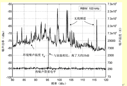 由現(xiàn)場測試可知,在接收FM調(diào)頻信號(hào)時(shí),ActivvTM有源天線的性能相當(dāng)于耳機(jī)連接線型天線,雖然這兩種天線的尺寸有很大差別??紤]到有源天線的體積小,它的幅射電阻大約只有1mΩ,而寄生損失電阻至少有1Ω左右,增益在-30~-50dBi的范圍內(nèi)。對(duì)于大多數(shù)RF工程師來講,這樣的增益是很難接受的。但是有一個(gè)因素極大地放寬了接收FM調(diào)頻信號(hào)時(shí)對(duì)增益的要求,即很高的環(huán)境噪聲溫度。圖8是一個(gè)消聲室(為了得到保守的估計(jì))在屏蔽裝置拿走后的噪聲電平。大多數(shù)無線系統(tǒng)工作在頻率高于1GHz的范圍,環(huán)境噪聲接近室溫,增益為-10dBi,相當(dāng)于信噪比降低了10dB,在FM頻段內(nèi),在城市的大部分地區(qū),由于人為噪聲的影響,噪聲電平高了大約20dB(對(duì)于調(diào)幅會(huì)更高)。因此,與完美的雙極電線相比,效率差的天線收到的信號(hào)較弱,噪聲較小。圖9給出了增益不同(0、-20、-40dB)的三種天線不同噪聲溫度時(shí)的G/T值。所有三種天線都接到噪聲指數(shù)為6dB的接收器上。對(duì)于增益為-40dB的實(shí)際天線(在室溫下G/T值減少46dB),當(dāng)情況相同時(shí),在23.000K的典型溫度下性能提高了19dB。對(duì)于有源天線,通過壓制接收器的噪聲指數(shù),可以把性能再提高6dB。所以,從信噪比方面看,增益為 -40dB的無源天線,只比完美的雙極天線差27dB。