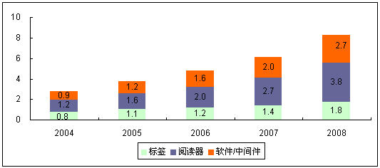 RFID在中國(guó)起步較晚,但受益于中國(guó)二代身份證市場(chǎng)的強(qiáng)勁需求,市場(chǎng)出現(xiàn)了短期大規(guī)模的井噴增長(zhǎng)。2004~2007年,中國(guó)RFID整體市場(chǎng)規(guī)模急速增長(zhǎng),到2008年隨著中國(guó)二代身份證市場(chǎng)的成熟,中國(guó)RFID整體市場(chǎng)銷售額出現(xiàn)下滑。