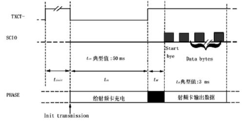 以下給出基站讀取數(shù)據(jù)的時序(如圖2),由射頻卡發(fā)出的數(shù)據(jù)采用FSK調(diào)制。
