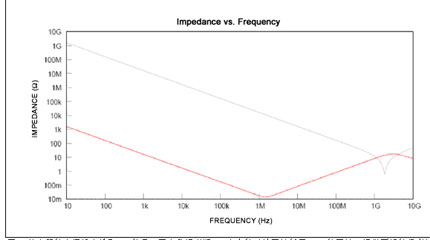 圖1.放大器的電源線會(huì)拾取RF信號(hào)。圖中數(shù)據(jù)表明1μF電容的對地阻抗低于10pF的阻抗,提供更好的噪音抑制能力