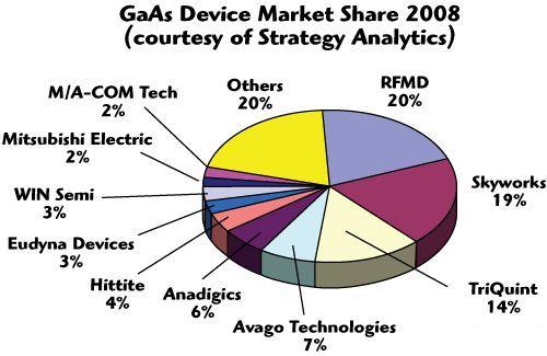經(jīng)過多年的發(fā)展,GaAs供應商已經(jīng)形成了穩(wěn)定的市場格局,由于GaAs產(chǎn)品與工藝關系非常大,大部分廠商都有自己的工廠。下圖是經(jīng)濟危機開始時2008年GaAs市場占有率情況。