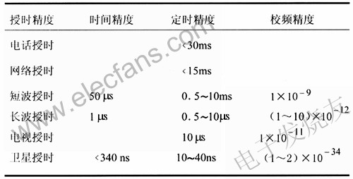 衛(wèi)星授時(shí)GPS導(dǎo)航系統(tǒng):提供的時(shí)間信號(hào)對(duì)世界協(xié)調(diào)時(shí)跟蹤,精度優(yōu)于100ns。GPS全球覆蓋,接收設(shè)備體積小,可以接收6顆衛(wèi)星信號(hào),可用來提供2.048Mbit/s基準(zhǔn)時(shí)間信號(hào)。俄羅斯的GLONASS衛(wèi)星導(dǎo)航系統(tǒng):目前系統(tǒng)未完成完善,接收設(shè)備商業(yè)化不夠。中國的北斗導(dǎo)航系統(tǒng):精度達(dá)到50ns,目前覆蓋中國,同步衛(wèi)星信號(hào)接收設(shè)備體積較大,系統(tǒng)還未建成。(3)網(wǎng)絡(luò)授時(shí):通過互聯(lián)網(wǎng)授時(shí)。使用NTP(NetworkTimeProtocol,網(wǎng)絡(luò)時(shí)間協(xié)議,RFC1305)。(4)電話授時(shí):通過公共電話網(wǎng),用戶用調(diào)制解調(diào)器接首時(shí)間信號(hào)。(5)電視授時(shí):通過電視網(wǎng)授時(shí)。(6)電信有線傳輸網(wǎng)授時(shí)表1是授時(shí)精度比較表1