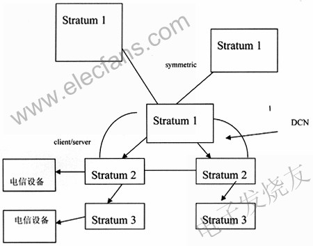 本地網(wǎng)級(jí)的Stratum1時(shí)間服務(wù)器之間互相聯(lián)網(wǎng),以symmetric方式互相校時(shí),避免GPS時(shí)間源出故障造成中斷,還可以達(dá)到更高精度。Stratum1時(shí)間服務(wù)器對(duì)下級(jí)采用client/server方式。Stratum1時(shí)間服務(wù)器取得GPS時(shí)間信號(hào)和其他授時(shí)方式時(shí)間信號(hào),比如其他導(dǎo)航衛(wèi)星,短波,長波方式,互為備用。上下級(jí)Stratum采用DCN相連或?qū)>€相連,保持穩(wěn)定相連。各級(jí)時(shí)間服務(wù)器把時(shí)間信號(hào)發(fā)到各個(gè)通信設(shè)備,如圖3所示。