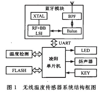 無(wú)線溫度傳感器主要由單片機(jī)控制單元、藍(lán)牙模塊、溫度檢測(cè)單元、接口電路及其它輔助電路組成,系統(tǒng)結(jié)構(gòu)如圖1所示??刂茊卧桕?yáng)單片機(jī)為整個(gè)系統(tǒng)的核心,對(duì)檢測(cè)到的溫度數(shù)據(jù)進(jìn)行轉(zhuǎn)換、顯示、傳輸,外擴(kuò)4MBFLASH用于存儲(chǔ)程序和溫度數(shù)據(jù)。藍(lán)牙模塊包括藍(lán)牙芯片、放大器、非平衡變壓器(Balun)等,負(fù)責(zé)與藍(lán)牙控制終端進(jìn)行無(wú)線連接和數(shù)據(jù)傳輸,按鍵完成系統(tǒng)設(shè)置、復(fù)位等信息輸人,測(cè)量的溫度數(shù)據(jù)在傳輸?shù)娇刂平K端的同時(shí)在LED上顯示,并通過(guò)揚(yáng)聲器定時(shí)語(yǔ)音播報(bào)當(dāng)前溫度數(shù)據(jù)和超限報(bào)警。