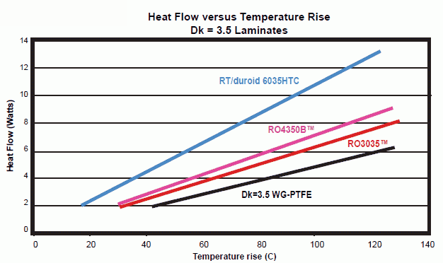 由于很多系統(tǒng)(包括商業(yè)通信和戰(zhàn)術(shù)軍事系統(tǒng))都需要具有高可靠性和穩(wěn)定的電氣性能,電路板材料供應(yīng)商近年來(lái)非常關(guān)注熱管理問(wèn)題,開(kāi)發(fā)出的材料不僅能夠處理類似功率放大器等電路中的較高功率級(jí),而且在高溫下不會(huì)發(fā)生電氣性能改變。例如,Rogers Corporation公司最近發(fā)布的RT/duroid 6035HTC電路材料就是一種陶瓷填充PTFE復(fù)合材料,其導(dǎo)熱率高達(dá)1.44 W/m/K,是標(biāo)準(zhǔn)FR-4型電路板材料的好幾倍(見(jiàn)圖1)。這種材料整合了穩(wěn)定的機(jī)械與電氣性能以及導(dǎo)熱性能,因此可作為高頻功率放大器的理想材料。