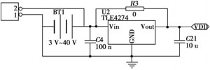 無(wú)線傳感器通常的工作電壓范圍為3.0V~3.6V。此次電源設(shè)計(jì)加入了TLFA274穩(wěn)壓器(如圖2所示),可轉(zhuǎn)換3V~40V的電壓,比如通常使用的小型電池或者是汽車電池,給使用者帶來(lái)了很大的方便。
