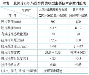 膠片冷卻機與密煉機、壓片機配套使用。將密煉機煉好的塑煉膠或混煉膠,經(jīng)壓片后,膠片進入該機進行浸泡,涂隔離劑后進入掛桿,經(jīng)冷卻干燥,最后進行連續(xù)疊片。這種膠片冷卻機是集日本、英國、臺灣等廠家的長處為一體,增加自主創(chuàng)新抓膠片的機械手部分,傳動裝置全部采用日本富士交流變頻器,實現(xiàn)抓膠片自動化、傳動調(diào)速同步化的自動控制系統(tǒng)。膠片冷卻機與國外同類機型主要技術(shù)參數(shù)對照表如附表所示。
