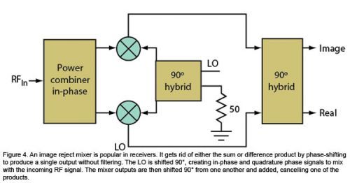圖4:鏡像抑制混頻器在接收器中最受歡迎。它可以通過相移去掉和頻或差頻產(chǎn)物,產(chǎn)生單個輸出,而不需要濾波。LO進行90°相移,產(chǎn)生同相和正交相位信號,與輸入的RF信號進行混頻。然后混頻器輸出互相進行90°相移,從而去掉部分產(chǎn)物。
