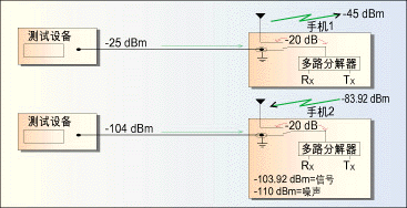 多數(shù)情況下,手機(jī)會因屏蔽很差的RF電纜或未連接的天線端口很容易受到噪聲影響。一般來講天線端口是噪聲的主要來源,特別是如果天線是在測試時才接上。圖3表示正在進(jìn)行靈敏度試驗(yàn)的手機(jī)對另一個正向鏈路功率-25dBm手機(jī)可能產(chǎn)生的影響情況,手機(jī)1是正在進(jìn)行測試的手機(jī),具有較高的-25dBm正向鏈路功率。由于手機(jī)1發(fā)射信道功率為-25dBm,假設(shè)未連接開關(guān)的衰減是20dB,那么通過天線未連接端口泄露出的信號可能高達(dá)-45dBm。