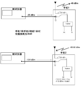 假設(shè)在最壞情況下,手機(jī)1距離手機(jī)2 1米遠(yuǎn)(假定只有遠(yuǎn)場效應(yīng),近場因素很難考慮),將兩個手機(jī)平行對準(zhǔn)且手機(jī)之間沒有衰減材料,則手機(jī)2的天線會收到一個高達(dá)-83.92dBm的信號。這樣手機(jī)2的接收器就會有-103.92dBm干擾信號,因?yàn)榧僭O(shè)天線到過電開關(guān)的衰減為20dB。這個例子說明了一個手機(jī)在另一手機(jī)接收信道上產(chǎn)生噪聲的一般原因,根據(jù)例中所做假設(shè),在實(shí)際執(zhí)行中還有很多情況會引起不同的結(jié)果,這也為認(rèn)識哪種噪聲會從一個手機(jī)進(jìn)入另一個手機(jī)信道提供了基礎(chǔ)。方位、距離、開關(guān)衰減、屏蔽、天線設(shè)計(jì)和實(shí)現(xiàn)方式等,這些因素都會在引入噪聲的整個轉(zhuǎn)換中發(fā)揮作用。