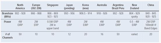 圖2:EPC Class1 G2的900MHz UHF 頻段范圍在各國的分配情況不一。