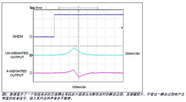 評(píng)估音頻性能的一個(gè)重要指標(biāo)是設(shè)備在打開或關(guān)斷時(shí),耳機(jī)(或揚(yáng)聲器)出現(xiàn)的“咔嗒”聲或其它奇怪的瞬態(tài)噪聲。隨著人們對(duì)產(chǎn)品性能期望值的提高,無(wú)瞬態(tài)雜音成為人們選擇產(chǎn)品的一項(xiàng)重要指標(biāo),因而也是便攜式音頻設(shè)備的關(guān)鍵賣點(diǎn)。直到目前為止,業(yè)界仍然從主觀上評(píng)價(jià)這種咔嗒聲,“較低的咔嗒聲”和“無(wú)咔嗒聲工作”等描述代表了對(duì)咔嗒聲定量分析的主觀判斷。但是,用戶的期望值在變化,設(shè)計(jì)人員需要得到評(píng)判咔嗒聲的客觀指標(biāo)。