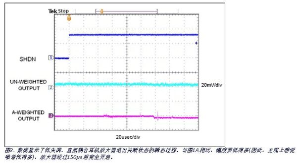 第二種瞬變過(guò)程,即直流耦合耳機(jī)放大器(圖2),似乎淹沒(méi)在A加權(quán)濾波之前示波器的噪聲底中。對(duì)于這種放大器,大部分音頻來(lái)自從關(guān)斷到完全工作時(shí)產(chǎn)生的直流失調(diào)電壓。由于失調(diào)只有幾個(gè)毫伏,沒(méi)有經(jīng)過(guò)濾波的信號(hào)不能精確決定咔嗒聲的大小。采用A加權(quán)濾波后,從噪聲基底中提取出直流耦合耳機(jī)放大器失調(diào)產(chǎn)生的咔嗒聲,獲得更客觀的測(cè)量結(jié)果。 (注意,沒(méi)有顯示濾波后的信號(hào)標(biāo)度V/div。)