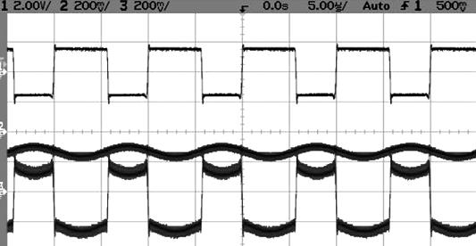 該圖對應(yīng)的是大電阻電機(jī)的情況,占空比仍為60%,感應(yīng)電阻為0.1Ω。同樣,軌線1為電壓,軌線2為電流,軌線3為瞬態(tài)功率。值得注意的是,當(dāng)負(fù)載增大,平均電機(jī)電流也相應(yīng)增大(從絕對意義而言)。用高阻抗電壓計測得的RMS功耗為20mV (2瓦)。
