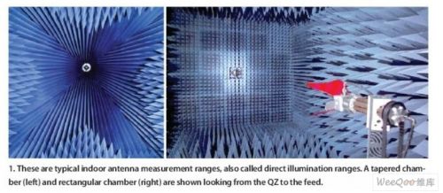 在傳統(tǒng)的遠(yuǎn)場(chǎng)天線測(cè)試場(chǎng)中,發(fā)射和接收天線分別位于對(duì)方的遠(yuǎn)場(chǎng)處,兩者通常隔得足夠遠(yuǎn)以模擬想要的工作環(huán)境。AUT被距離足夠遠(yuǎn)的源天線所照射,以便在AUT的電氣孔徑上產(chǎn)生接近平面的波陣面。遠(yuǎn)場(chǎng)測(cè)量可以在室內(nèi)或室外測(cè)試場(chǎng)進(jìn)行。室內(nèi)測(cè)量通常是在微波暗室中進(jìn)行。這種暗室有矩形的,也有錐形的,專門設(shè)計(jì)用來減少來自墻體、地板和天花板的反射(圖1)。在矩形微波暗室中,采用一種墻面吸波材料來減少反射。在錐形微波暗室中,錐體形狀被用來產(chǎn)生照射。