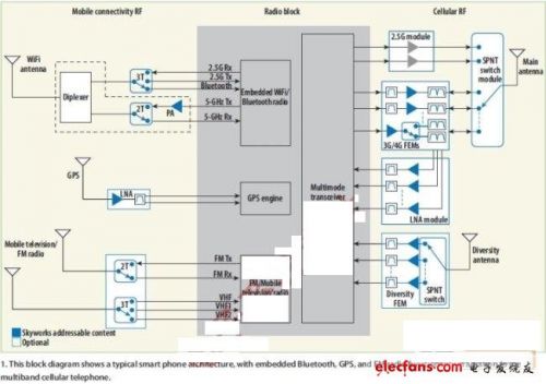 圖1:該模塊圖顯示了典型的智能手機架構(gòu),除了多頻段蜂窩電話外,還包含嵌入式藍牙、GPS和調(diào)頻收音機功能。