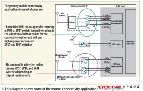 移動無線連接選件一般有兩種實現(xiàn)方式:使用分立元件和芯片組進行設(shè)計,或通過第三方模塊制造商提供。不管實現(xiàn)細節(jié)如何,在智能手機的移動連接側(cè)存在射頻開關(guān)的多種應(yīng)用。