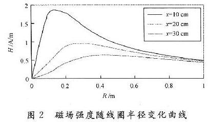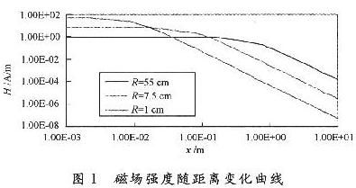 在與發(fā)射天線的距離x為常數(shù)并簡單地假定發(fā)射天線線圈中電流I不變的情況下,如果改變發(fā)送天線的半徑R時,就可以根據(jù)距離x與天線半徑R之間的關(guān)系得到最大的磁場強度H.這意味著:對于每種射頻識別系統(tǒng)的閱讀器作用距離都對應(yīng)有一個最佳的天線半徑R.如果選擇的天線半徑過大,那么在與發(fā)射天線的距離x=0處,磁場強度是很小的;相反,如果天線半徑的選擇太小,那么其磁場強度則以z的三次方的比例衰減,如圖2所示。