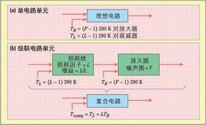 上列方程中,TR和TL分別為放大器(接收電路)和衰減器(損耗線)的有效溫度,F(xiàn)和L分別代表噪聲譜和損耗因子。圖2b是應(yīng)用于一對(duì)級(jí)聯(lián)電路元件(一條損耗線加上一個(gè)放大器)的模型,其中損耗線的增益可表示為1/L。