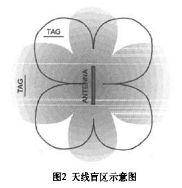 由于環(huán)形天線的電磁場(chǎng)在其臨近區(qū)域分布不均勻,因此會(huì)出現(xiàn)讀寫盲區(qū)。如圖2中黑線勾勒出的范圍之外區(qū)域一般為單個(gè)天線的讀寫盲區(qū)。經(jīng)反復(fù)實(shí)驗(yàn)證明將電子標(biāo)簽擺放位置轉(zhuǎn)到與最佳位置成40°角區(qū)域時(shí),一般可正常讀寫操作。