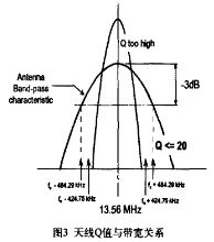 由式(2)可看出,天線的傳輸帶寬B與品質(zhì)因數(shù)Q成反比。因此,過高的品質(zhì)因數(shù)將導(dǎo)致帶寬縮小,降低讀寫器的調(diào)制邊帶信號(hào)幅度,導(dǎo)致讀寫器無法與標(biāo)簽通信。天線Q值與3 dB帶寬的關(guān)系曲線如圖3所示。由圖3可看出:環(huán)形天線與50 Ω的負(fù)載相連時(shí),其Q值最好不超過30。為了優(yōu)化天線的性能。讀寫器匹配電路的駐波比應(yīng)小于1:1.2。