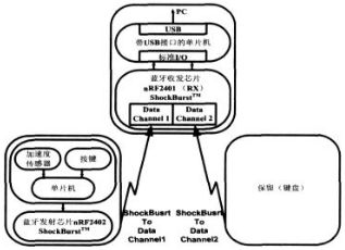 nRF2402是單片2.4 ~2.5GHz射頻發(fā)射芯片, 發(fā)射器包含頻率合成器、功放、晶體振蕩器和調(diào)制器 ,輸出功率和信道選擇很容易通過3-線接口編程實(shí)現(xiàn), 在輸 出功率為-5dBm時(shí)電流消耗僅10mA ,內(nèi)置的ShockBurst技術(shù)以及休眠模式用來降低發(fā)送數(shù)據(jù)的電流消耗 ,以延長電池使用壽命 ,并且向pc發(fā)送的數(shù)據(jù)包也應(yīng)盡可能少(取采樣速率為100采樣點(diǎn)/秒)。ShockBurst技術(shù)使用片內(nèi)先入先出堆棧(FIFO)低速處理數(shù)據(jù)(10Kbps)而高速發(fā)送數(shù)據(jù)(1Mbps)。