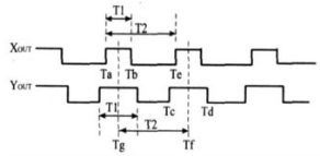 為了實(shí)現(xiàn)高精度測(cè)量,考慮到T2易受溫度漂移的影響,必須周期性地更新T2的平均值。一種新的改進(jìn)型脈寬調(diào)制(PWM)解碼方法是通過占空比調(diào)制在X軸和Y軸使用相同的三角形參考波 ,使得每個(gè)周期中 T1的中點(diǎn)達(dá)到同步 ,這種方法能加快數(shù)據(jù)傳輸時(shí)間,也稱之為高速解碼,X軸和Y軸的占空比輸出如圖2所示。