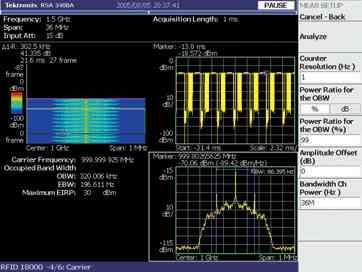 政府規(guī)定要求控制發(fā)射信號的功率、頻率、帶寬。這些規(guī)定防止有害干擾并保證每個(gè)發(fā)射者都是頻帶內(nèi)其他用戶的友好鄰居。對于許多頻譜分析儀特別是通常用于脈沖信號能量測量的掃頻頻譜分析儀,進(jìn)行此類測量是具有挑戰(zhàn)性的。RTSA 能夠分析一個(gè)完整的分組發(fā)射過程的能量特點(diǎn),也能直接測量跳頻信號的載波頻率,而無需將信號置于一個(gè)跨度的中心。按一下按鍵,分析儀就能識別一個(gè)瞬時(shí) RFID 信號的調(diào)制方式并能夠?qū)β省㈩l率和帶寬進(jìn)行監(jiān)管測量,使預(yù)一致性(pre-compliance)測試過程變得非常靈活和方便 [參閱圖2]。預(yù)一致性測試有助于確保產(chǎn)品一次通過一致性測試,而無需重新設(shè)計(jì)和重新測試。