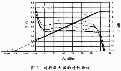 式中:b為截距;Ks為對(duì)數(shù)檢測(cè)器的斜率,是一個(gè)常數(shù);Pin是輸入信號(hào)的功率。在一定的動(dòng)態(tài)范圍內(nèi),可通過(guò)Matlab仿真軟件得到對(duì)數(shù)放大器的特性曲線,如圖2所示。