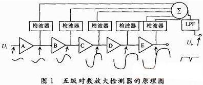 射頻信號(hào)檢測(cè)的實(shí)質(zhì)是如何實(shí)現(xiàn)將功率信號(hào)無(wú)失真地轉(zhuǎn)換成電壓信號(hào),而這個(gè)轉(zhuǎn)換工作則由對(duì)數(shù)放大檢測(cè)器來(lái)完成,因此,對(duì)數(shù)放大檢測(cè)器是射頻測(cè)量的關(guān)鍵。它的核心是對(duì)數(shù)放大器,對(duì)數(shù)放大器之間采用直接耦合方式,分成N級(jí),每級(jí)由對(duì)數(shù)放大器和檢波器組成。每級(jí)的輸出送到求和器,由求和輸出經(jīng)低通濾波器后得到一個(gè)電壓信號(hào)。N一般取值為5~9級(jí),級(jí)數(shù)越多,單級(jí)增益越小,則輸出特性曲線越趨向于線性,這里以5級(jí)為例進(jìn)行分析,具體電路如圖1所示。