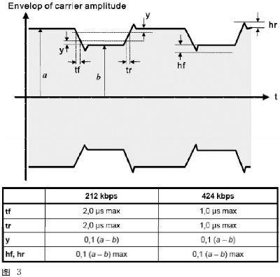 由于NFC106kbps為100%ASK調(diào)變,所以對整個High/Low信號的封包結(jié)構(gòu)都有相當(dāng)詳細(xì)的定義。其中幾個參數(shù)包括從100%下降到5%Am時間(t1)、5%Am持續(xù)時間(t2)、Am由5%上升至60%時間(t4)即overshoot的范圍。而212/424kbps則是8%~30%的調(diào)變率。