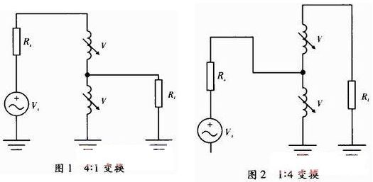 變壓器:主要實現低頻段,隨著工作頻段的升高,這類電路的應用越來越少。傳輸線變壓器可以實現寬帶阻抗變換,實現4:1和1:4工作模式如圖1和圖2所示??梢詫崿F平衡和非平衡的變換,尤其在電視機外接天線到同軸線輸入端口的連接中得到應用。