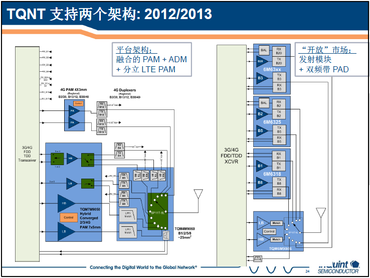 對于多頻多模的3G/4G手機,針對射頻前端器件的設計如何實現(xiàn)集成?熊挺表示,目前有兩種方案:一種是融合架構,將不同頻率的射頻功率放大器PA集成;另一種架構則是沿信號鏈路的集成,即將PA與雙工器集成。兩種方案各有優(yōu)缺點,適用于不同的手機。融合架構,PA的集成度高,對于3個以上頻帶巨有明顯的尺寸優(yōu)勢,5-7個頻帶時還巨有明顯的成本優(yōu)勢。缺點是雖然PA集成了,但是雙工器仍是相當復雜,并且PA集成時有開關損耗,性能會受影響。而對于后一種架構,性能更好,功放與雙功器集成可以提升電流特性。所以TriQuint可以提供兩種架構的方案,大于6個頻段時(指3G和4G)采用融合架構,而小于四個頻段時采用PA與雙工器集成的方案PAD。