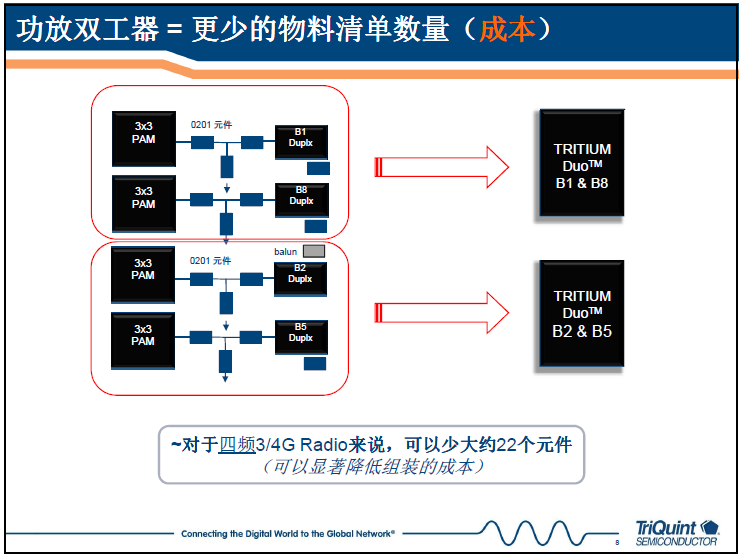 日前,TriQuint推出業(yè)內(nèi)最小針對3G和4G智能手機的雙頻帶功放雙工器(PAD),在單一緊湊模塊中結合了兩個特定頻帶的功率放大器(PA)和雙工器,有效地替代了多達12個分立器件,在降低物料清單(BOM)成本的同時,通過共同的占位面積簡化設計、加速整體產(chǎn)品上市時間帶來一系列額外的成本節(jié)省。